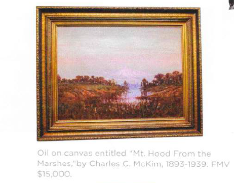 Oil on canvas entitled “Mt. Hood From the Marshes,” by Charles C. McKim, 1893-1939. FMV $15,000.
